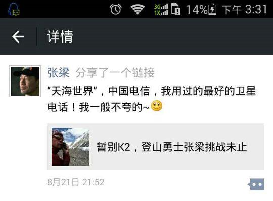 張梁一向?qū)踩旁诘谝晃唬腿ツ觌x頂峰僅有300多米的地方理智選擇后撤一樣;這一次,同樣為了安全和通信順暢的考慮,他帶上了天海世界提供的舒拉亞XT-LITE衛(wèi)星電話,前兩天還在六千多海拔的高峰上與我們進行通話,愿我們的舒拉亞電話變成張梁的安全守護神,讓我們一起祝福他再次完成挑戰(zhàn),凱旋歸來。張梁,加油!